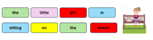 • First, provide a story and/or a picture. Then, give learners a set of puzzle pieces with words and ask them to form one sentence or several sentences. If there are more sentences, you can later ask your learners to put them in the most logical order. To facilitate the process of learning and recalling of specific words or places of those words in a sentence it is useful to connect verbal information to multi-sensory representations, such as use of different colors, shapes, sizes, and different approaches to language learning, such as total physical response. After a means of multi-sensory representation is chosen, you have to be consistent in its use. These materials can also be used with the exercise known as scrambled sentences, shown in Figure 1.